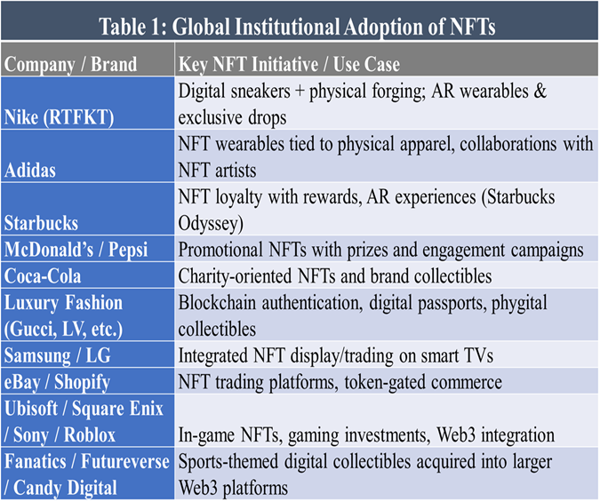 See Table 1: Global Institutional Adoption of NFTs.