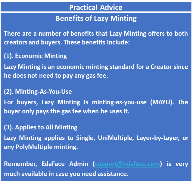 This is a process in which the creator does not have to pay the gas fee for minting the NFT upfront; rather, he can list his NFT on the EdaFace Marketplace arena for sale.